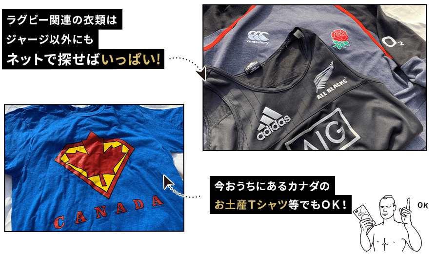 大会期間中はラグビー関連の衣類や釜石会場で試合をする出場国にまつわる服を着てみましょう!