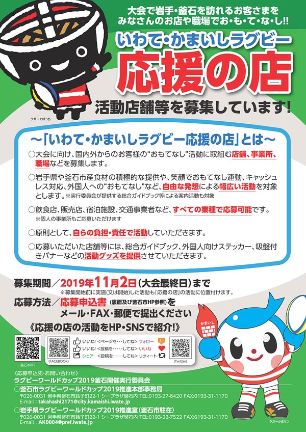また、国内外からのお客様の“おもてなし”活動に取り組む店舗、事業所、職場などを対象とした「いわて・かまいしラグビー応援の店」(以下「応援の店」)を募集します。業種や所在地を問わず、すべての店舗、事業所などでご参加いただけますので、多数のご応募をお待ちしています。