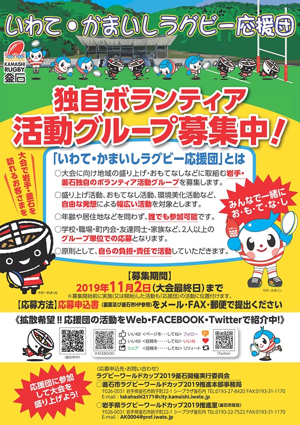 ラグビーワールドカップ2019釜石開催実行委員会では、大会の盛り上げと“おもてなし”の推進、環境美化活動等を担う独自のボランティア活動「いわて・かまいしラグビー応援団」に参加するグループを募集しています。