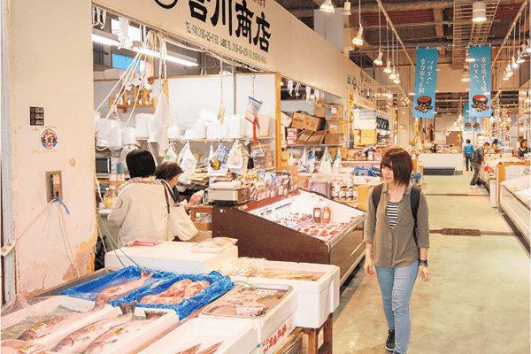 橋上市場に代わって誕生した「サン・フィッシュ釜石」。1階は地元の旬をギュッと集めた市場、2階は海鮮料理などが味わえる飲食店になっています。